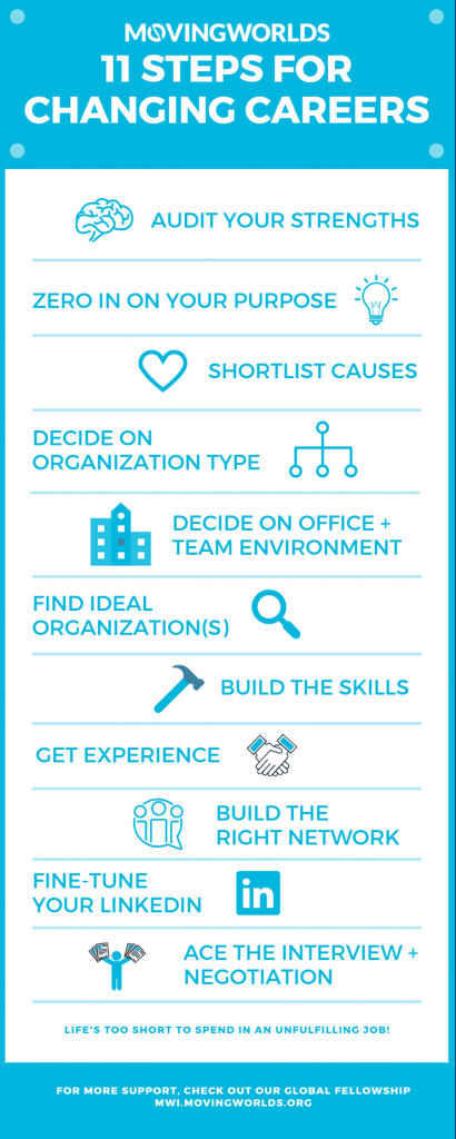 After supporting hundreds of professionals through career growth and transition in our MovingWorlds Institute, we’ve found that taking on a learning mindset is the most important thing you can do to evolve your job to have more purpose, or to change your career path to find it. Take the time to reflect on what motivates you, and then explore - inside through reflection and outside through experimentation - what makes you come alive in your current job and in future jobs. Equally, make sure to look at other people that might have similar purpose patterns to see if you can learn from their journeys.
