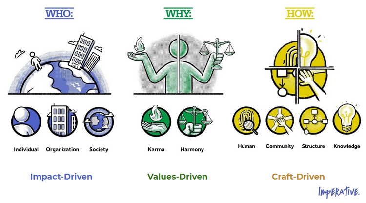 According to Imperative, we each have a dominant category of drivers that influence us the most. If your WHO driver is the most powerful, you are an impact-driven leader. If you are most driven by WHY, then you are a values-driven leader. And lastly, if your HOW dimension is the strongest, you are a craft-driven leader. A simple way to think about it is like this: An impact-driven leader will be most driven by seeing the results of their work, a craft-driven leader is most motivated by the way in which a task is carried out, and a values-driven leader sees the most importance in the ethics behind a decision.